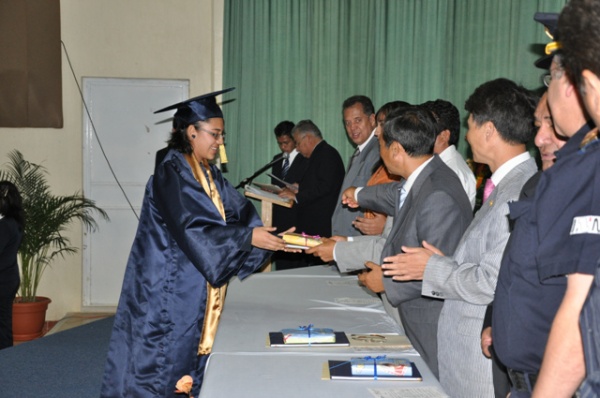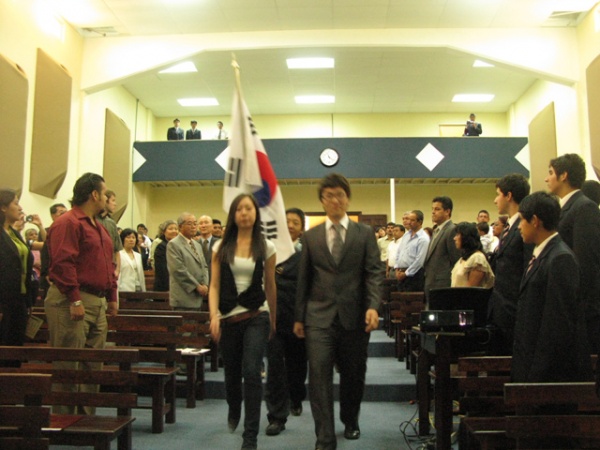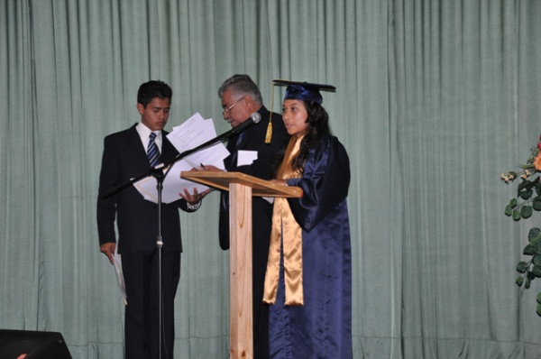 Graduates entered and the national anthems of both Mexico and South Korea were played as the national flags of Mexico and South Korea entered. Pastor Jeremias Cahuich who leads the Chapel prayed for the ceremony, followed by a welcoming speech of the Representative, Young Yong Lee, congratulatory speeches of the Commissioner of Education of Chiapas and Mexican Ambassador to Korea, laudatory addresses of representatives of middle and high school, Gabriela and Illiana, and the presentation of the prize and diploma.